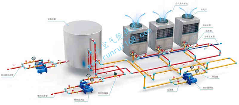 整棟有200個員工,采用花灑方式?jīng)_涼,每人限制50L的水,要樓頂安裝2臺5匹空氣能熱泵熱水器,配備2個5噸保溫水箱,熱水管道接到每層沖涼房內(nèi),每處都安裝冷熱調(diào)節(jié)閥,定時供應(yīng)熱水,整個系統(tǒng)全自動按制
