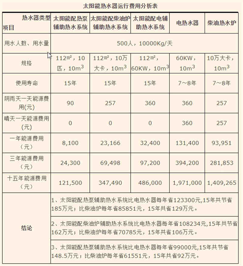 太陽能按輔助加熱的不同可分為太陽能配熱泵輔助加熱系統(tǒng)、太陽能配柴油爐輔助加熱系統(tǒng)、太陽能配電加熱輔助加熱系統(tǒng)。由于一年有90天左右的時間為陰雨天,需要用到輔助加熱,那么采用不同的輔助加熱使得太陽能系統(tǒng)全年運行費用產(chǎn)生較大的差異。