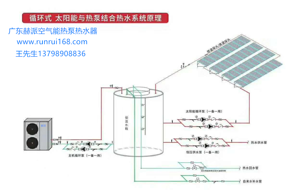 赫派空氣能熱泵輔助平板式太陽能集熱器熱水系統(tǒng)工作原理