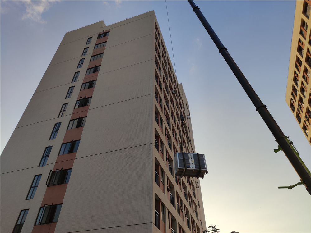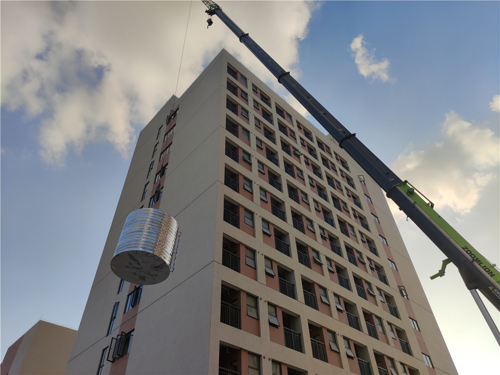 赫派空氣能熱泵,不銹鋼保溫水箱等設(shè)備到場吊裝到樓頂