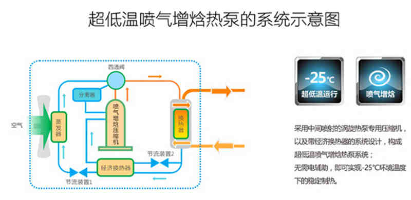 第二代噴氣增焓和多級(jí)壓縮技術(shù)的聯(lián)合應(yīng)用,大大提高制熱效率。