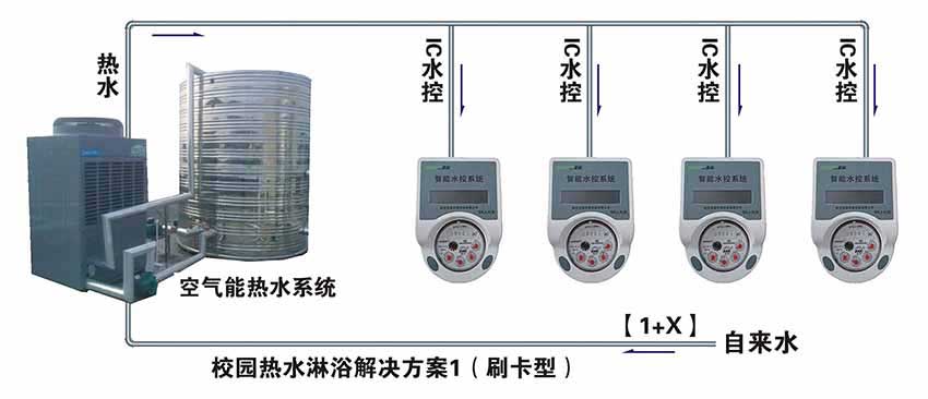 本系統(tǒng)采用新一代太陽能空氣源中央熱水機組為系統(tǒng)核心部件,加保溫水箱、熱水管道、回水管道和整套智能控制系統(tǒng)安裝而成。循環(huán)式機組熱泵具有無可比擬的優(yōu)越性,其具有循環(huán)產(chǎn)水、循環(huán)保溫、出水溫度恒定(55℃)等特點,學(xué)生使用我公司發(fā)行的專用IC卡刷卡取水,24小時供應(yīng)熱水。