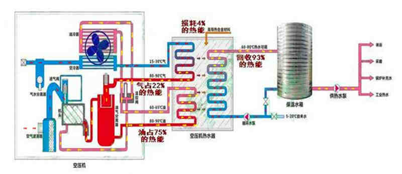 螺桿空壓機在運行中把電能轉(zhuǎn)換為機械能,機械能又轉(zhuǎn)換為熱能,在機械能轉(zhuǎn)換為熱能過程中,空氣得到強烈的高壓壓縮,溫度驟升,這是機械能量轉(zhuǎn)換現(xiàn)象,機械螺桿的高速旋轉(zhuǎn),同時也摩擦發(fā)熱,這些產(chǎn)生的高熱由空壓機潤滑油的加入混合成油/氣蒸汽排出機體,這部分高溫油/氣流的熱量相當于空壓機輸入功率的1/4,產(chǎn)生的溫度通常常在80℃(冬季)-100℃(夏秋季),這些熱能都由于機器運行溫度的需求,被無端地廢氣排往大氣中,即空壓機的散熱系統(tǒng)來完成機器運行的溫度要求??諌簷C余熱回收可使水、油冷熱交換,達到機油降溫,冷水升溫,從而產(chǎn)出生活、生產(chǎn)所需熱水。