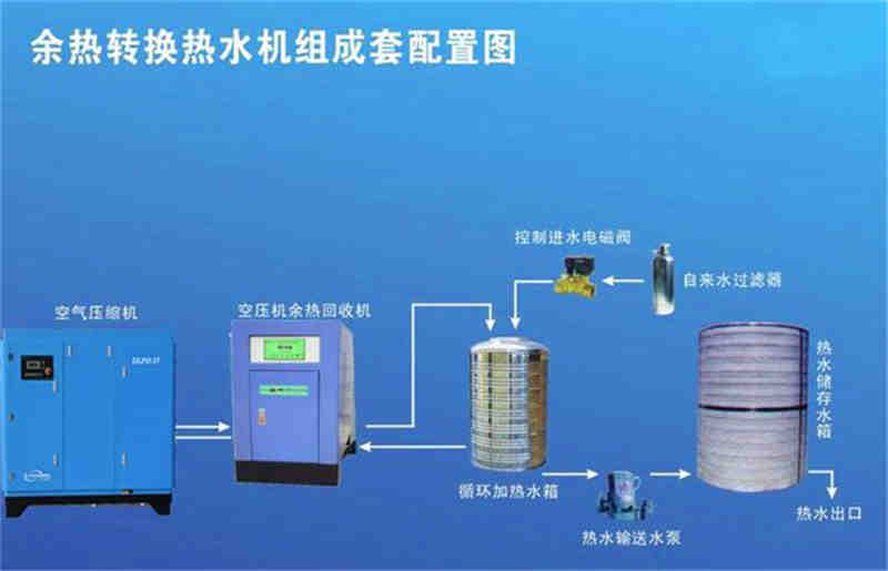 空壓機(jī)余熱回收熱水工程應(yīng)注意的幾點(diǎn): 1、要有大功率的螺桿機(jī)效果才好。 2、空壓機(jī)的運(yùn)行效率要高,24小時(shí)不能停機(jī)。 3、空壓機(jī)房和鍋爐房要有空間來(lái)放置安裝余熱回收設(shè)備。