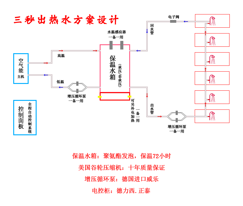 10、熱泵熱水系統(tǒng)所配套的材料,均采用世界、國(guó)內(nèi)名牌產(chǎn)品,連接水管的配件均采用銅、不銹鋼配件