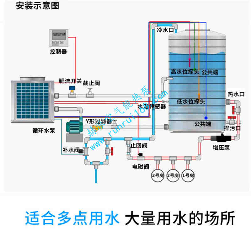 空氣能熱泵 機(jī)組與水箱通過管道連接和水泵循環(huán),讓水在系統(tǒng)中循環(huán)加熱,并儲(chǔ)存在保溫水箱里,以備各種不同需求時(shí)使用。適用于集中熱水需要和大量使用熱水的場(chǎng)所,如賓館、公共浴室、醫(yī)院、療養(yǎng)院、學(xué)校、健身中心、美發(fā)中心、部隊(duì)以及廠礦企業(yè)的集體宿舍等