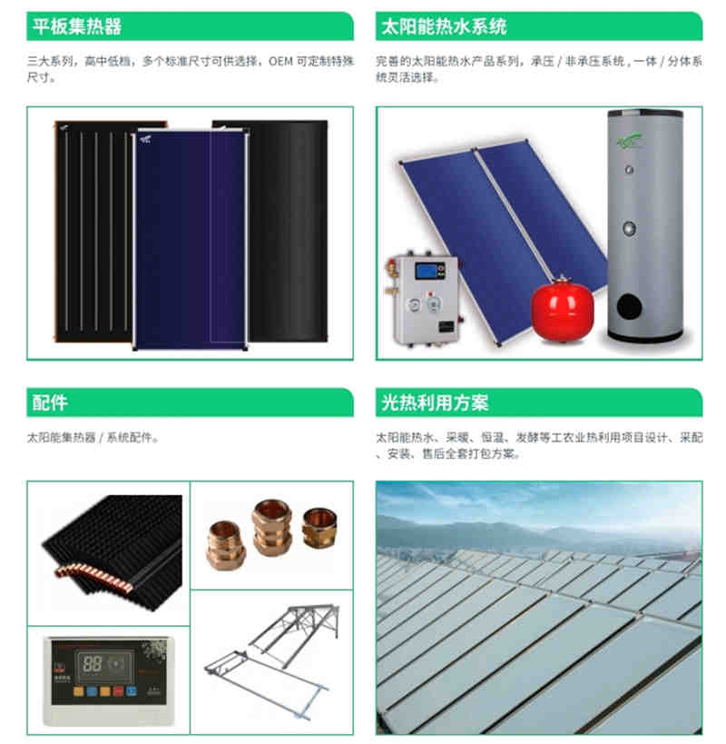 集熱器通常分為兩類(lèi):平板型太陽(yáng)能集熱器及真空管太陽(yáng)能集熱器;真空管型太陽(yáng)能集熱器則包括全玻璃真空管、熱管式真空管和U型管式真空管;其使用條件及特點(diǎn)各有裨益。
